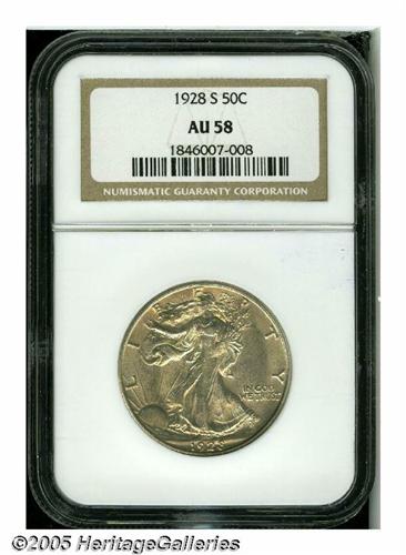 <B>1928-S<50C> AU58 NGC.</B></I> The '28-S is almost always found weakly struck in the centers. This piece is softly defined up and down the figure of Liberty, and throughout the eagle's left breast and leg. Light tan patina visits portions of each side, and considerable luster is seen to remain. The surfaces are quite clean throughout.