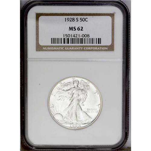 <B>1928-S<50C> MS62 NGC.</B></I> A brilliant and highly lustrous example that is limited in grade by a few wispy obverse luster grazes. Liberty's central highpoints are typically defined for an S-mint production. The 1928-S is much scarcer than the 1929-S in Mint State despite similar mintages. <BR><BR><B>Important notice:</B> Heritage usually auctions material at the rate of 200-250 lots per hour. On some occasions eBay Live bid software or the Internet may not be able to keep up with the pace of the auction. We recommend placing a realistic absentee bid now as insurance to avoid disappointment. Occasionally the auctioneer may eliminate or reject an eBay Live bid, and the auctioneer may also reopen a lot after the close of the eBay live bidding (usually because we missed an audience bid), and may reject your bid even if it shows you as the winning bidder. By bidding via eBay Live, you agree that Heritage may award the lot to another bidder at its sole discretion under the circumstances described above or any other reasonable circumstances. Since eBay bids are not shown to us until we open the lot on the floor, we treat those bids just like floor bids. In most cases the floor responds before the eBay bid is presented to us, due to Internet lag time, so for consistency we have made it a policy that floor bids are always considered first over tie eBay live bids. Also please note that all Heritage lots purchased through eBay Live carry a 20% Buyer's Premium. Please make sure you read the Terms and Conditions before you bid. This lot is being auctioned in conjunction with a live floor auction by Heritage Galleries & Auctioneers. All final auction and invoice information will be supplied by Heritage Galleries & Auctioneers, and all other information should be considered preliminary. Lot:2935 <BR><BR><B>Winning Notification and Billing:</B> After the FINAL session in this auction is complete, Heritage will send e-mail and snail mail invoices. This process normally takes several days. All final auction and invoice information will be supplied by Heritage Galleries & Auctioneers, and all other information should be considered preliminary. <BR><BR>This auction will be conducted on a live auction floor and over the Internet through eBay Live. If you choose to place an absentee bid, please take a moment to <font color='#0000ff'><u><a href='http://pages.ebay.com/liveauctions/help/before/laabsentee.html'>learn how eBay Live absentee bidding works</a></u></font><font color='#000000'>