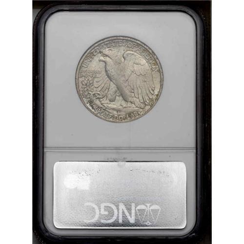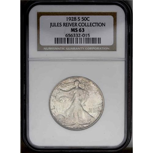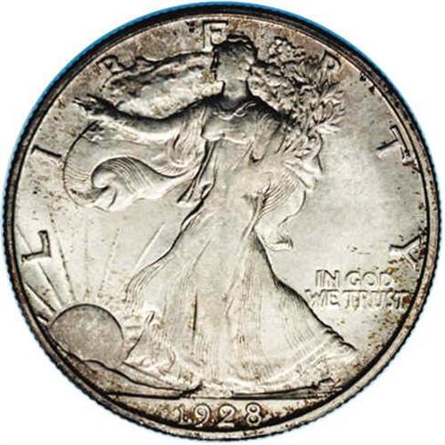 <B>1928-S<50C> MS63 NGC.</B></I> Golden-gray toning on lustrous surfaces with wisps and splashes of orange-gold and violet at the borders. The strike shows softness on the highpoints of the designs as is typical for the issue. We can only infer that the San Francisco Mint was trying to reduce operating costs by reducing striking pressures for half dollars, thereby extending the useful life of the dies.