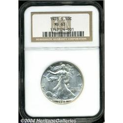 <B>1928-S<50C> MS63 NGC.</B></I> The 1928-S (1.9 million coins produced) is similar in overall rarity to the 1927-S. In the finer Mint State grades, however, the edge goes to the former issue. The '28-S is certainly not the most carefully produced date in the Walking Liberty Half Dollar series, and the present example is a little bluntly defined over the central highpoints. On the other hand, the surfaces are significantly free of outwardly distracting bagmarks. Both sides are bright, untoned, and possessed of swirling mint frost. An unusually pleasant appearance is presented for the assigned grade. <BR><BR><B>Important notice:</B> Heritage usually auctions material at the rate of 200-250 lots per hour. On some occasions eBay Live bid software or the Internet may not be able to keep up with the pace of the auction. We recommend placing a realistic absentee bid now as insurance to avoid disappointment. Occasionally the auctioneer may eliminate or reject an eBay Live bid, and the auctioneer may also reopen a lot after the close of the eBay live bidding (usually because we missed an audience bid), and may reject your bid even if it shows you as the winning bidder. By bidding via eBay Live, you agree that Heritage may award the lot to another bidder at its sole discretion under the circumstances described above or any other reasonable circumstances. Since eBay bids are not shown to us until we open the lot on the floor, we treat those bids just like floor bids. In most cases the floor responds before the eBay bid is presented to us, due to Internet lag time, so for consistency we have made it a policy that floor bids are always considered first over tie eBay live bids. Also please note that all Heritage lots purchased through eBay Live carry a 20% Buyer's Premium. Please make sure you read the Terms and Conditions before you bid. </span></font></tr></table></td></tr></table>