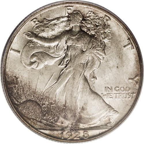 <B>1928-S 50C MS63 PCGS.</B></I> Soft luster on both sides is visible beneath light ivory color with deep steel and iridescent toning over the lower left part of the obverse and upper left reverse. This example displays the usual strike with weakness at the center on each side. Although this is not a rare date, it is certainly elusive in Mint State grades.<BR><BR><b>Shipping:</b> Coin/Currency (<a target="_blank" href="http://www.heritageauctions.com/common/shipping.php">view shipping information</a>)