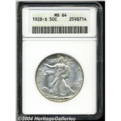 <B>1928-S<50C> MS64 ANACS.</B></I> Untoned over the obverse, a silver-gray sheen is presented on that side. The reverse exhibits some mottled russet-brown shadings. Well defined with some contact marks visible in the right obverse field.<BR><I>From the Virgil Farstad Collection, Part Two.</B></I> <BR><BR><B>Important notice:</B> Heritage usually auctions material at the rate of 200-250 lots per hour. On some occasions eBay Live bid software or the Internet may not be able to keep up with the pace of the auction. We recommend placing a realistic absentee bid now as insurance to avoid disappointment. Occasionally the auctioneer may eliminate or reject an eBay Live bid, and the auctioneer may also reopen a lot after the close of the eBay live bidding (usually because we missed an audience bid), and may reject your bid even if it shows you as the winning bidder. By bidding via eBay Live, you agree that Heritage may award the lot to another bidder at its sole discretion under the circumstances described above or any other reasonable circumstances. Since eBay bids are not shown to us until we open the lot on the floor, we treat those bids just like floor bids. In most cases the floor responds before the eBay bid is presented to us, due to Internet lag time, so for consistency we have made it a policy that floor bids are always considered first over tie eBay live bids. Also please note that all Heritage lots purchased through eBay Live carry a 20% Buyer's Premium. Please make sure you read the Terms and Conditions before you bid.