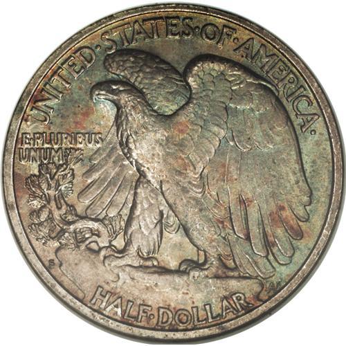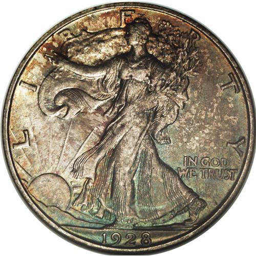 <B>1928-S 50C MS64 NGC.</B></I> Lustrous surfaces are covered with a mix of cobalt-blue, yellow-gold, and grayish-tan patina. Sharply struck design features display good detail, save for the usual softness in the centers. A few minute marks concealed within the toning of the right obverse field define the grade.<BR><BR><b>Shipping:</b> Coin/Currency (<a target="_blank" href="http://www.heritageauctions.com/common/shipping.php">view shipping information</a>)