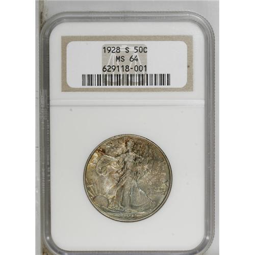 1928-S 50C MS64 NGC. Lustrous surfaces are covered wit