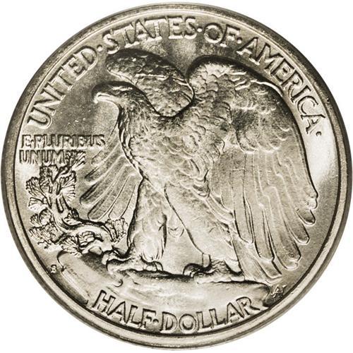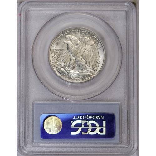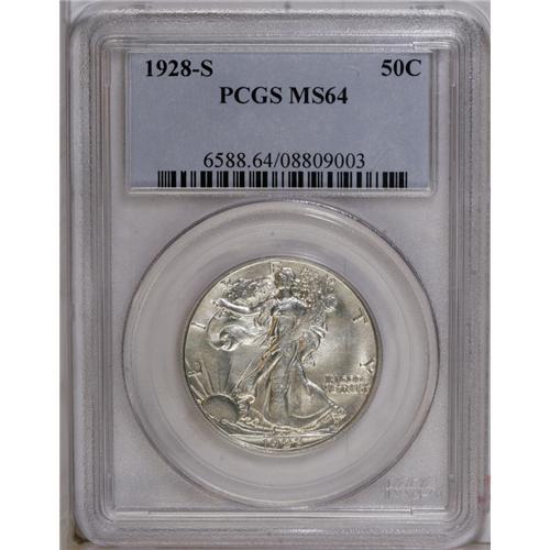 <B>1928-S<50C> MS64 PCGS.</B></I> A lower mintage (1.9 million pieces) issue, the '28-S is anything but common in Mint State. It is scarce at the near-Gem level of preservation, and increasingly difficult any finer. This piece is typically weak over the centers but has an appealing, softly frosted sheen and mere traces of gold and russet toning on the mostly silver-gray surfaces. A couple of noticeable abrasions, located on the eagle's breast and on the wing feathers just above his head, are the only detracting marks on the coin.<BR><I>From The Big Tex Registry Set of Walking Liberty Halves.</B></I>