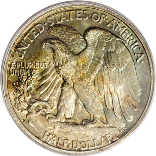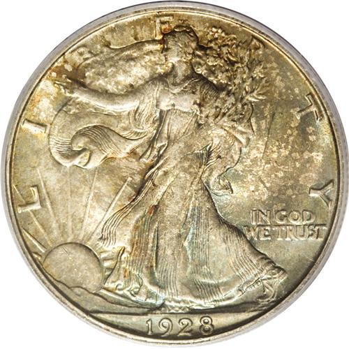 <B>1928-S 50C MS64 PCGS.</B></I> Large S. Crisp serifs differentiate this mintmark from the Small S found on lesser denominations and some other halves. The luminous surfaces are awash in blue-green, ruby-gold, and russet patina. Aside from a pair of long, thin abrasions that appear in the right obverse field, the surfaces are clean, though the central devices exhibit the striking weakness that defines many examples of this issue. An elusive condition rarity any finer.<BR><BR><b>Shipping:</b> Coins & Currency (<a target="_blank" href="http://www.heritageauctions.com/common/shipping.php">view shipping information</a>)