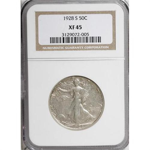 <B>1928-S 50C XF45 NGC.</B></I> NGC Census: (8/327). PCGS Population (11/428). Mintage: 1,940,000. Numismedia Wsl. Price for NGC/PCGS coin in XF45: $214. (#6588)<BR><BR><B>Coin Engraver:</B> Adolph A. Weinman<BR><BR><b>Shipping:</b> Coins & Currency (<a target="_blank" href="http://www.heritageauctions.com/common/shipping.php">view shipping information</a>)