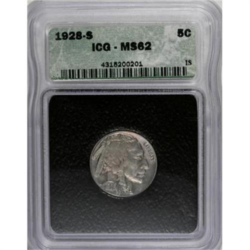 <B>1928-S 5C MS62 ICG.</B></I> NGC Census: (79/359). PCGS Population (47/564). Mintage: 6,936,000. Numismedia Wsl. Price for NGC/PCGS coin in MS62: $233. (#3965)<BR><BR><B>Coin Engraver:</B> James E. Fraser<BR><BR><b>Shipping:</b> Coins & Currency (<a target="_blank" href="http://www.heritageauctions.com/common/shipping.php">view shipping information</a>)