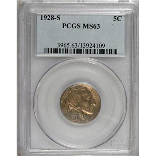 <B>1928-S 5C MS63 PCGS.</B></I> Well struck throughout, save for a touch of weakness on the bison's head and shoulder. The satiny surfaces are nearly blemish-free, with one tiny scrape noted just below the bison's nose. <BR><BR><B>Coin Engraver:</B> James E. Fraser<BR><BR><b>Shipping:</b> Coins & Currency (<a target="_blank" href="http://www.heritageauctions.com/common/shipping.php">view shipping information</a>)
