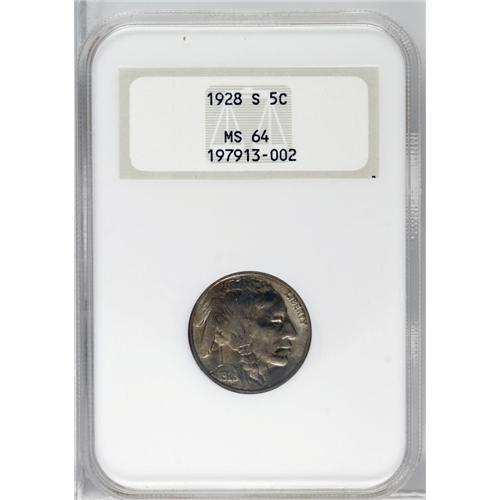 <B>1928-S<5C> MS64 NGC.</B></I> Olive-green and gold colors shimmer throughout this lustrous, carefully preserved near-Gem. The strike is actually sharp where the die definition allows, but the dies were in use for so long at the time that this piece was struck, that the coin has a very mushy overall appearance, as made.