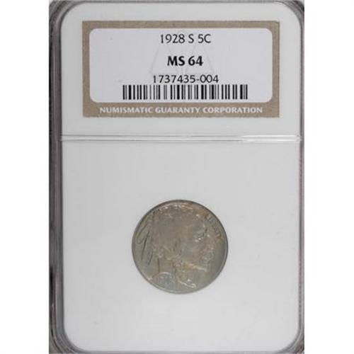 <B>1928-S 5C MS64 NGC.</B></I> Delicate blue, violet, and golden-tan toning drapes the luminous surfaces of this S-mint Buffalo nickel. Surprisingly well-detailed for the issue with elegant eye appeal. NGC has graded 43 finer pieces (11/07).<BR><BR><B>Coin Engraver:</B> James E. Fraser<BR><BR><b>Shipping:</b> Coins & Currency (<a target="_blank" href="http://www.heritageauctions.com/common/shipping.php">view shipping information</a>)
