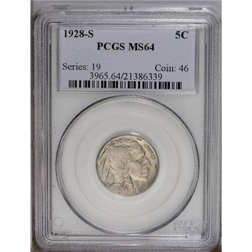 <B>1928-S<5C> MS64 PCGS.</B></I> Honey-gold patina occasionally overlays the steel-blue surfaces of this satiny near-Gem. The strike is above average, and there are no obtrusive handling marks. A scarce issue in Mint State, more so than the low mintage but hoarded San Francisco dates between 1929 to 1931. <BR><BR><B>Important notice:</B> Heritage usually auctions material at the rate of 200-250 lots per hour. On some occasions eBay Live bid software or the Internet may not be able to keep up with the pace of the auction. We recommend placing a realistic absentee bid now as insurance to avoid disappointment. Occasionally the auctioneer may eliminate or reject an eBay Live bid, and the auctioneer may also reopen a lot after the close of the eBay live bidding (usually because we missed an audience bid), and may reject your bid even if it shows you as the winning bidder. By bidding via eBay Live, you agree that Heritage may award the lot to another bidder at its sole discretion under the circumstances described above or any other reasonable circumstances. Since eBay bids are not shown to us until we open the lot on the floor, we treat those bids just like floor bids. In most cases the floor responds before the eBay bid is presented to us, due to Internet lag time, so for consistency we have made it a policy that floor bids are always considered first over tie eBay live bids. Also please note that all Heritage lots purchased through eBay Live carry a 20% Buyer's Premium. Please make sure you read the Terms and Conditions before you bid. This lot is being auctioned in conjunction with a live floor auction by Heritage Galleries & Auctioneers. All final auction and invoice information will be supplied by Heritage Galleries & Auctioneers, and all other information should be considered preliminary. Lot:1105 <BR><BR><B>Winning Notification and Billing:</B> After the FINAL session in this auction is complete, Heritage will send e-mail and snail mail invoices. This process normally takes several days. All final auction and invoice information will be supplied by Heritage Galleries & Auctioneers, and all other information should be considered preliminary. <BR><BR>This auction will be conducted on a live auction floor and over the Internet through eBay Live. If you choose to place an absentee bid, please take a moment to <font color='#0000ff'><u><a href='http://pages.ebay.com/liveauctions/help/before/laabsentee.html'>learn how eBay Live absentee bidding works</a></u></font><font color='#000000'>