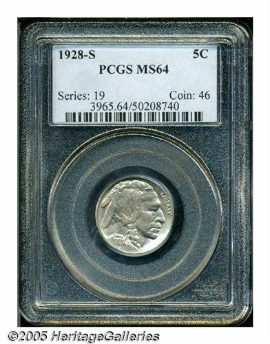 <B>1928-S<5C> MS64 PCGS.</B></I> The 1928-S is an important strike rarity from the 1920s. This piece displays sharp definition over most of the design elements, though the hair on the bison's head is a tad weak. Lustrous surfaces appear to be devoid of significant marks, and are awash in pastel ice-blue and champagne patination.