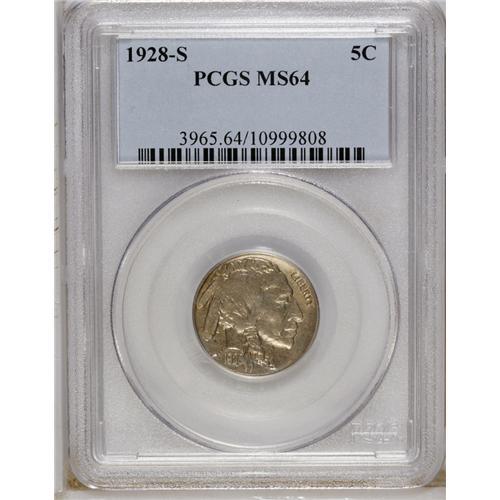 <B>1928-S 5C MS64 PCGS.</B></I> Well struck and satiny with pleasing olive-gray toning and few marks. A modest abrasion is noted just above the knot in the Indian's hair braid.<BR><BR><b>Shipping:</b> Coin/Currency (<a target="_blank" href="http://www.heritageauctions.com/common/shipping.php">view shipping information</a>)