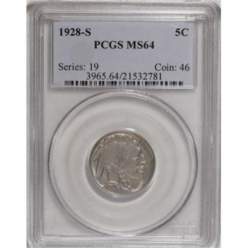 <B>1928-S 5C MS64 PCGS.</B></I> Pleasing detail for this S-mint issue, including a well-defined horn, though the bison's shoulder shows softness. Delicate blue and gold tints visit the quicksilver surfaces of this lovely near-Gem.<BR><BR><B>Coin Engraver:</B> James E. Fraser<BR><BR><b>Shipping:</b> Coins & Currency (<a target="_blank" href="http://www.heritageauctions.com/common/shipping.php">view shipping information</a>)