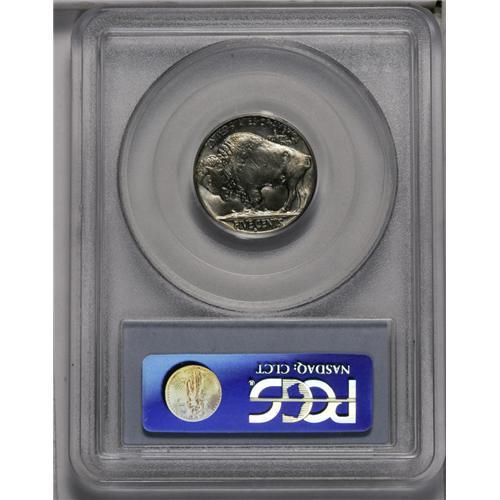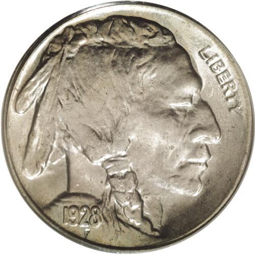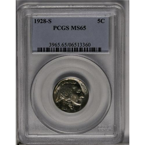 <B>1928-S<5C> MS65 PCGS.</B></I> Radiantly lustrous surfaces display a thin veil of barely discernible beige, lilac, and ice-blue , and a scattering of tiny pepper-like spots. Both sides exhibit what David Lange (2000) says "... is the bright, liquid appearance associated with polished planchets that have not been fully compressed by the dies." While Lange also indicates that most examples display a general softness in the date, the mintmark, and the bison's forehead, the current specimen reveals sharp definition in these and the remaining elements of the design, though for accuracy we note some softness in the bison's hair immediately adjacent to the forehead. There are no distracting marks to report. Population: 53 in 65, 5 finer (6/06).