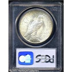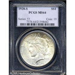 <B>1928-S<img border='0' src='http://www.heritagecoins.com/images/star.gif' width=10 height=10>$1 MS64 PCGS.</B></I> Typically softly struck with a creamy, satiny appearance, and some pale golden toning near the peripheries. There are a few too many contact marks on the reverse to allow the Gem grade, but this would still have to be classified as a high end example, for a near-Gem. Pleasing visual appeal. Lot:10736