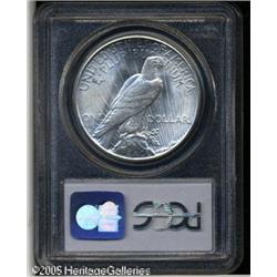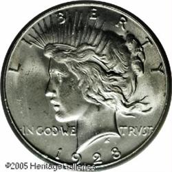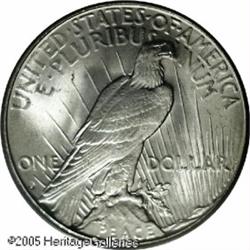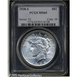 <B>1928-S<img border='0' src='http://www.heritagecoins.com/images/star.gif' width=10 height=10>$1 MS65 PCGS.</B></I> The 1928-S is considered by many Peace Dollar experts as the scarcest issue in the series in Gem condition. Only 1.63 million pieces were produced and quantities have not been seen for decades, although examples are readily available up to and including the borderline Gem grade level. This strict MS65 is sharply struck and brilliant throughout with shimmering mint frost over both sides. A couple of small marks are seen on the eagle's leg on the reverse. Population: 30 in 65, 1 finer (1/05). Lot:10738