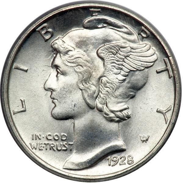 1928-S Mercury Dime. PCGS graded MS-64 PQ. A nice white coin with almost full split bands. Pop 1; 82 finer (PCGS # 4970) .