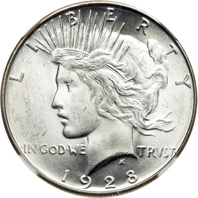 1928-S Peace Dollar. NGC graded MS-64 PQ. A blast white satiny mint beauty with remarkably clean surfaces for this numerical grade, thus our Premium Quality designation. Pop 1,122; 42 finer, 2 in 64 star, 39 in 65, 1 in 66.