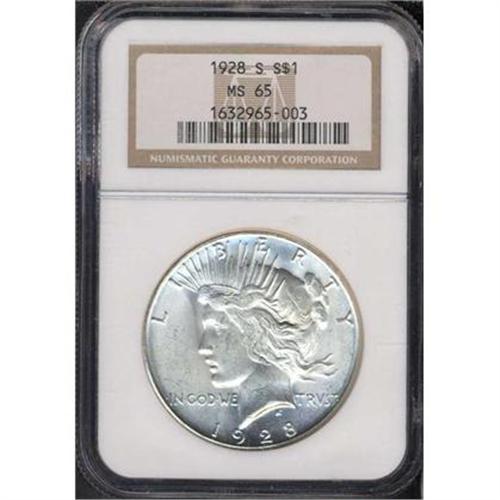 <b>1928-S Peace Dollar. NGC graded MS65.</b> Brilliant and lustrous with a vibrant white color plus spinning cartwheel radiance over both sides. Nicely struck for the date, perhaps not entirely so in the centers, but certainly a coin that gets proper mention where completeness of design is almost impossible to achieve <b>(PCGS # 7374)</b>