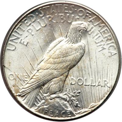 1928-S Peace Dollar. PCGS graded MS-63. A hint of light gold obverse toning. The 1928-S is a scarcer branch mint issue inasmuch as only a few bags of scruffy Mint States were found in the LaVere Redfield hoard in the mid-1970s. Once these got distributed into the market, their price began to rise inexorably. Choice examples like this tend to have frosty luster, a few light marks in the hair and on the eagle's wing, and generally "average" strike quality (PCGS # 7374).