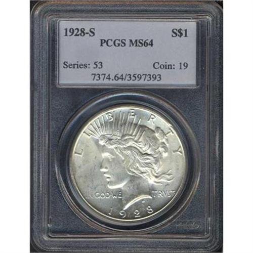 <b>1928-S Peace Dollar. PCGS graded MS64.</b> Snow-white luster careening with cartwheel definition and only a few tiny marks. A choice example of the challenging 1928-S. The central area of the obverse is nicely impressed by the dies, while the center of the reverse is typically mushy, with little feather definition on the wing or leg <b>(PCGS # 7374)</b>