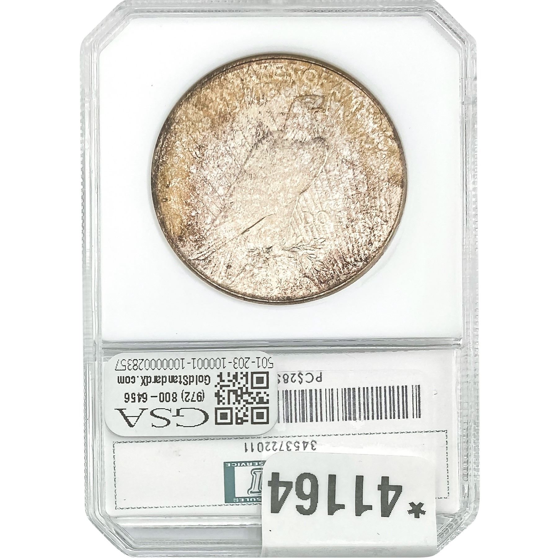 COINS AND CURRENCY LISTED IN GSA’S CATALOG AS GRADED AND ENCAPSULATED BY PCGS, NGC, ANACS, ICG, PCGS CURRENCY, PMG, PCGS BANKNOTE GRADING, CMC OR ANY OTHER THIRD-PARTY GRADING SERVICE ARE LIKEWISE SOLD “AS-IS” EXCEPT AS EXPRESSLY SET FORTH HEREIN. ALL THIRD-PARTY GRADING SERVICE GUARANTEES, INCLUDING AUTHENTICITY, ARE THE SOLE RESPONSIBILITY OF THE THIRD-PARTY GRADING SERVICE AND NOT WARRANTIES OR GUARANTEES OF GSA. BIDDERS SHOULD CONTACT THESE THIRD-PARTY GRADING SERVICES DIRECTLY WITH RESPECT TO ANY CLAIMS OR QUESTIONS THEY MAY HAVE CONCERNING THEIR GUARANTEES AND WARRANTIES. BIDDERS ACKNOWLEDGE AND AGREE THAT AUCTIONEER IS NOT BOUND BY OR LIABLE FOR ANY OPINION OR CERTIFICATION BY ANY THIRD-PARTY GRADING SERVICE. REMOVAL OF A PRODUCT FROM ITS PROTECTIVE CASING OR HOLDER OR ALTERATION OF ANY COIN HOLDER WAIVES ALL RIGHTS CONCERNING THE PRODUCT CONTAINED THEREIN.