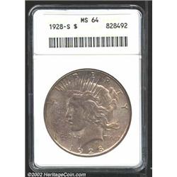 1928-S S$1 MS64 ANACS. Deeply toned in shades of lavender and olive-gold. Luster flows smoothly through the patina, and the strike is above average. An attractive near-Gem. Important notice: We expect to be auctioning lots at the rate of 200-250 per hour. Sometimes eBay Premier live bid software cannot keep up with that pace, so we strongly recommend that you place a realistic proxy bid now as insurance to avoid disappointment. Also please note that all Heritage/CAA lots purchased through eBay Premier carry a 20% Buyer's Premium.