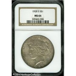 1928-S S$1 MS64 NGC. Deep mottled toning covers th <B>1928-S S$1 MS64 NGC.</B></I> Deep mottled toning covers this scarce semi-key date issue. The strike is a little soft in the centers, this surely being the reason the coin does not grade MS65. <BR><BR><B>Important notice:</B> Heritage usually auctions material at the rate of 200-250 lots per hour. On some occasions eBay Live bid software or the Internet may not be able to keep up with the pace of the auction. We recommend placing a realistic absentee bid now as insurance to avoid disappointment. Occasionally the auctioneer may eliminate or reject an eBay Live bid, and the auctioneer may also reopen a lot after the close of the eBay live bidding (usually because we missed an audience bid), and may reject your bid even if it shows you as the winning bidder. By bidding via eBay Live, you agree that Heritage may award the lot to another bidder at its sole discretion under the circumstances described above or any other reasonable circumstances. Since eBay bids are not shown to us until we open the lot on the floor, we treat those bids just like floor bids. In most cases the floor responds before the eBay bid is presented to us, due to Internet lag time, so for consistency we have made it a policy that floor bids are always considered first over tie eBay live bids. Also please note that all Heritage lots purchased through eBay Live carry a 20% Buyer's Premium. Please make sure you read the Terms and Conditions before you bid. This lot is being auctioned in conjunction with a live floor auction by Heritage Galleries & Auctioneers. All final auction and invoice information will be supplied by Heritage Galleries & Auctioneers, and all other information should be considered preliminary. Lot:7811