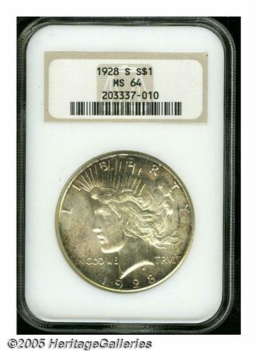 <B>1928-S<S$1> MS64 NGC.</B></I> Frosty and lustrous with light peripheral iridescence. This is a scarce date that is elusive in the higher Mint State grades. In fact, NGC has only certified 36 examples in higher grades than this one.<BR><I>From The Stig Ericsson Collection.</B></I>