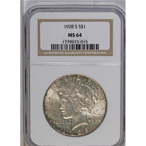 1928-S S$1 MS64 NGC. Highly lustrous with pale gold an