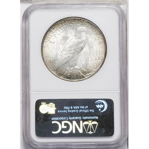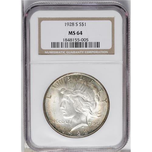 <B>1928-S<img border='0' src='http://www.heritagecoins.com/images/star.gif' width=10 height=10>$1> MS64 NGC.</B></I> Highly lustrous with visually enticing golden-brown, russet and aqua toning at the borders. Softly struck on the eagle's lower half, with a few scattered marks and luster grazes that prevent a higher grade.