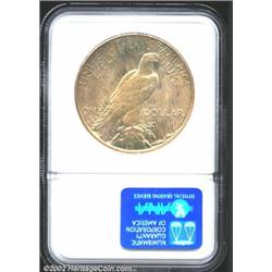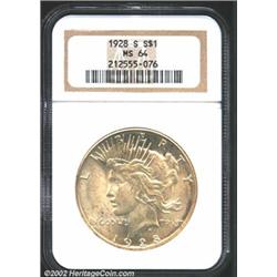 1928-S S$1 MS64 NGC. Light apricot patina. A nicely struck near-Gem that has well preserved surfaces. The portrait has a faint fingerprint. Although the 1928-S has a higher mintage than the much vaunted 1928, the 1928-S is actually slightly scarcer in better Uncirculated grades.From the Hans Poetsch Collection. Important notice: We expect to be auctioning lots at the rate of 200-250 per hour. Sometimes eBay Premier live bid software cannot keep up with that pace, so we strongly recommend that you place a realistic proxy bid now as insurance to avoid disappointment. Also please note that all Heritage/CAA lots purchased through eBay Premier carry a 20% Buyer's Premium. Please make sure you read the Terms and Conditions.