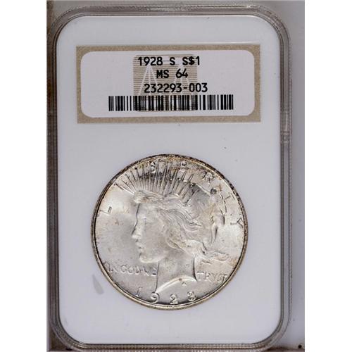 1928-S S$1 MS64 NGC. Lustrous, frosty silver-gray surf