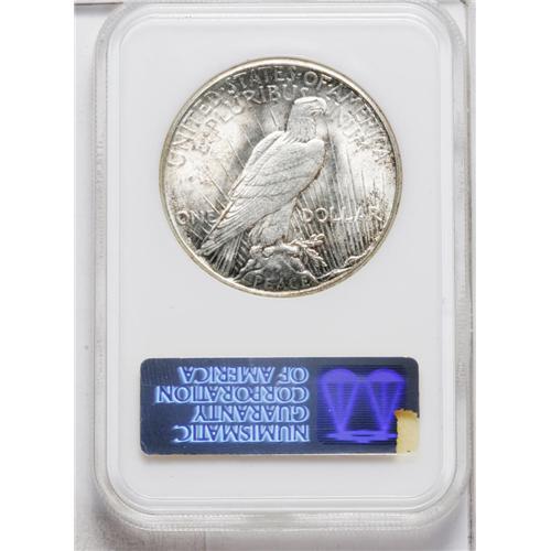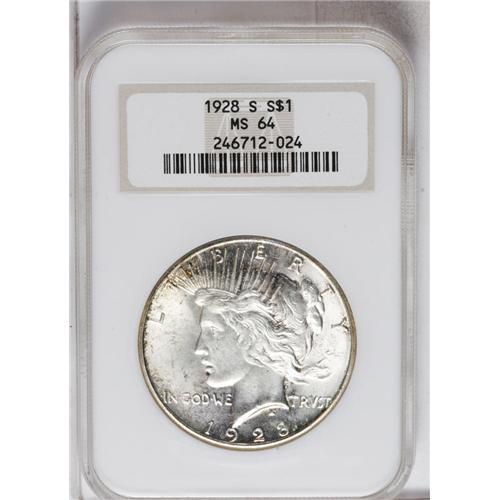 <B>1928-S<img border='0' src='http://www.heritagecoins.com/images/star.gif' width=10 height=10>$1> MS64 NGC.</B></I> Relatively well struck save for a small area with noticeable planchet chatter (as struck) on the eagle's front leg. Both sides are dappled with purple, reddish-orange, and navy-blue patination, enhancing the appeal of the dollar. Additionally, several small green spots are noticed on the obverse surface.