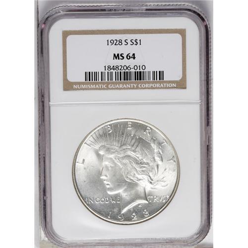<B>1928-S<img border='0' src='http://www.heritagecoins.com/images/star.gif' width=10 height=10>$1> MS64 NGC.</B></I> Slight weakness of strike is typical for the issue. This example is satiny and largely untoned except for small patches of olive, with marks appropriate for the grade.