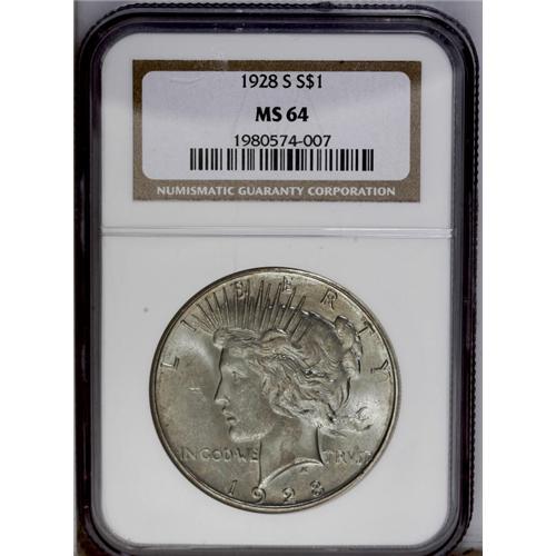 <B>1928-S<img border='0' src='http://www.heritagecoins.com/images/star.gif' width=10 height=10>$1> MS64 NGC.</B></I> The surfaces of this example are fully brilliant with frosty silver luster. Like most or all known examples, the interior letters on the reverse are shallow and somewhat indistinct. A highly desirable example of the date, seldom found any nicer.