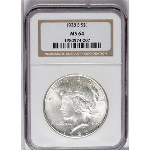 <B>1928-S<img border='0' src='http://www.heritagecoins.com/images/star.gif' width=10 height=10>$1> MS64 NGC.</B></I> The surfaces of this example are fully brilliant with frosty silver luster. Like most or all known examples, the interior letters on the reverse are shallow and somewhat indistinct. A highly desirable example of the date, seldom found any nicer.