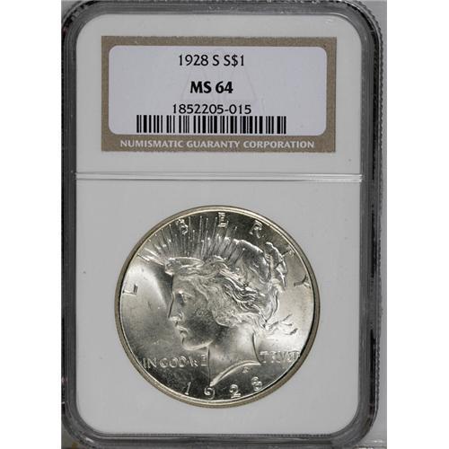 <B>1928-S<img border='0' src='http://www.heritagecoins.com/images/star.gif' width=10 height=10>$1> MS64 NGC.</B></I> The very lightest of toning and only a few light marks away from Gem status. Strongly struck and displaying premium quality for the assigned grade.