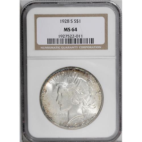 <B>1928-S<img border='0' src='http://www.heritagecoins.com/images/star.gif' width=10 height=10>$1> MS64 NGC.</B></I> VAM-4. An attractively toned golden-brown and ocean-blue example of this conditionally scarce issue. Lustrous and suitably struck. A few minor marks do not deny the eye appeal.