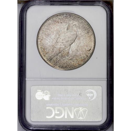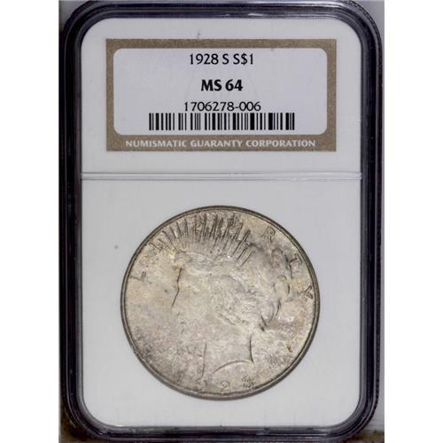 <B>1928-S<img border='0' src='http://www.heritagecoins.com/images/star.gif' width=10 height=10>$1> MS64 NGC.</B></I> VAM-4. Mottled tones of wheaten-russet and bluish-gray lightly adorn this near-Gem issue. Lustrous and crisply struck with a few moderate marks on the devices. <BR><BR><B>Important notice:</B> Heritage usually auctions material at the rate of 200-250 lots per hour. On some occasions eBay Live bid software or the Internet may not be able to keep up with the pace of the auction. We recommend placing a realistic absentee bid now as insurance to avoid disappointment. Occasionally the auctioneer may eliminate or reject an eBay Live bid, and the auctioneer may also reopen a lot after the close of the eBay live bidding (usually because we missed an audience bid), and may reject your bid even if it shows you as the winning bidder. By bidding via eBay Live, you agree that Heritage may award the lot to another bidder at its sole discretion under the circumstances described above or any other reasonable circumstances. Since eBay bids are not shown to us until we open the lot on the floor, we treat those bids just like floor bids. In most cases the floor responds before the eBay bid is presented to us, due to Internet lag time, so for consistency we have made it a policy that floor bids are always considered first over tie eBay live bids. Also please note that all Heritage lots purchased through eBay Live carry a 20% Buyer's Premium. Please make sure you read the Terms and Conditions before you bid. This lot is being auctioned in conjunction with a live floor auction by Heritage Galleries & Auctioneers. All final auction and invoice information will be supplied by Heritage Galleries & Auctioneers, and all other information should be considered preliminary. Lot:3868 <BR><BR><B>Winning Notification and Billing:</B> After the FINAL session in this auction is complete, Heritage will send e-mail and snail mail invoices. This process normally takes several days. All final auction and invoice information will be supplied by Heritage Galleries & Auctioneers, and all other information should be considered preliminary. <BR><BR>This auction will be conducted on a live auction floor and over the Internet through eBay Live. If you choose to place an absentee bid, please take a moment to <font color='#0000ff'><u><a href='http://pages.ebay.com/liveauctions/help/before/laabsentee.html'>learn how eBay Live absentee bidding works</a></u></font><font color='#000000'>