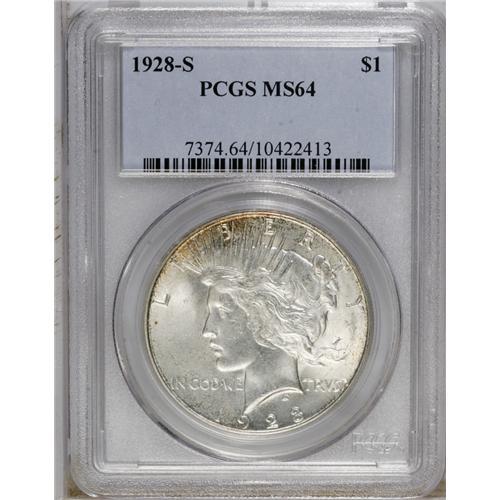 <B>1928-S S$1 MS64 PCGS.</B></I> A well struck near-Gem that has pretty luster. Two patches of tan toning appear at the periphery, one between the I and B of LIBERTY, and the other at the eagle's rock.<BR><BR><b>Shipping:</b> Coin/Currency (<a target="_blank" href="http://www.heritageauctions.com/common/shipping.php">view shipping information</a>)