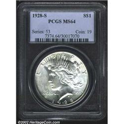 1928-S S$1 MS64 PCGS. Bright-white with a near-full strike and a few light abrasions as one might expect of the grade. Important notice: We expect to be auctioning lots at the rate of 200-250 per hour. Sometimes eBay Premier live bid software cannot keep up with that pace, so we strongly recommend that you place a realistic proxy bid now as insurance to avoid disappointment. Also please note that all Heritage/CAA lots purchased through eBay Premier carry a 20% Buyer's Premium. Please make sure you read the Terms and Conditions.