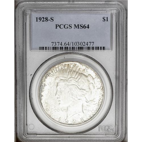 <B>1928-S<img border='0' src='http://www.heritagecoins.com/images/star.gif' width=10 height=10>$1> MS64 PCGS.</B></I> Deep russet-gray and amber toning graces the rims of this appealing near-Gem, which reveals few abrasions under a loupe but is somewhat softly struck through the centers. <BR><BR><B>Important notice:</B> Heritage usually auctions material at the rate of 200-250 lots per hour. On some occasions eBay Live bid software or the Internet may not be able to keep up with the pace of the auction. We recommend placing a realistic absentee bid now as insurance to avoid disappointment. Occasionally the auctioneer may eliminate or reject an eBay Live bid, and the auctioneer may also reopen a lot after the close of the eBay live bidding (usually because we missed an audience bid), and may reject your bid even if it shows you as the winning bidder. By bidding via eBay Live, you agree that Heritage may award the lot to another bidder at its sole discretion under the circumstances described above or any other reasonable circumstances. Since eBay bids are not shown to us until we open the lot on the floor, we treat those bids just like floor bids. In most cases the floor responds before the eBay bid is presented to us, due to Internet lag time, so for consistency we have made it a policy that floor bids are always considered first over tie eBay live bids. Also please note that all Heritage lots purchased through eBay Live carry a 20% Buyer's Premium. Please make sure you read the Terms and Conditions before you bid. This lot is being auctioned in conjunction with a live floor auction by Heritage Galleries & Auctioneers. All final auction and invoice information will be supplied by Heritage Galleries & Auctioneers, and all other information should be considered preliminary. Lot:3867 <BR><BR><B>Winning Notification and Billing:</B> After the FINAL session in this auction is complete, Heritage will send e-mail and snail mail invoices. This process normally takes several days. All final auction and invoice information will be supplied by Heritage Galleries & Auctioneers, and all other information should be considered preliminary. <BR><BR>This auction will be conducted on a live auction floor and over the Internet through eBay Live. If you choose to place an absentee bid, please take a moment to <font color='#0000ff'><u><a href='http://pages.ebay.com/liveauctions/help/before/laabsentee.html'>learn how eBay Live absentee bidding works</a></u></font><font color='#000000'>