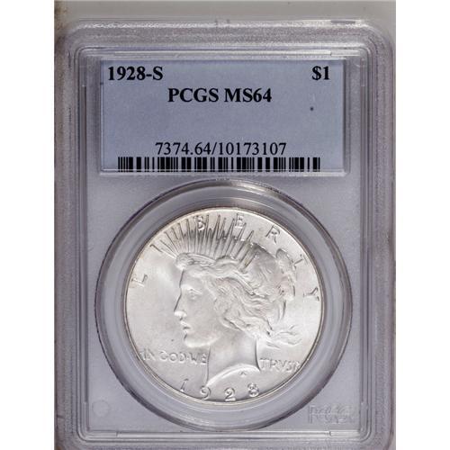 <B>1928-S<img border='0' src='http://www.heritagecoins.com/images/star.gif' width=10 height=10>$1> MS64 PCGS.</B></I> Two small patches of milky toning appear on the obverse of this otherwise brilliant coin. A nicely struck near-Gem with great luster.