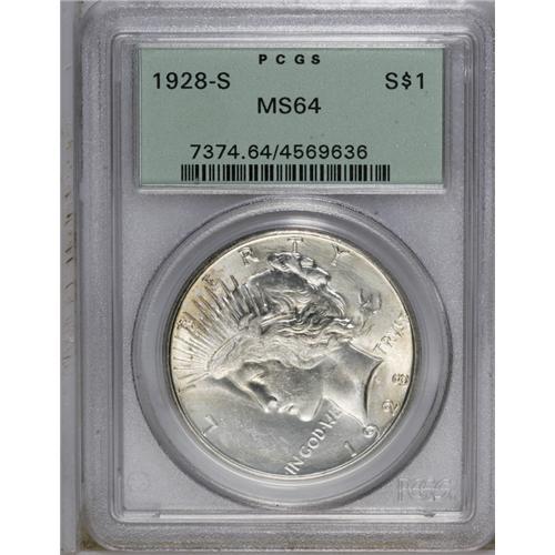 <B>1928-S<img border='0' src='http://www.heritagecoins.com/images/star.gif' width=10 height=10>$1> MS64 PCGS.</B></I> VAM-3. A Top 50 Variety. Blushes of apricot visit this lustrous and suitably struck near-Gem. Only minimal marks are encountered. Housed in a green label holder.