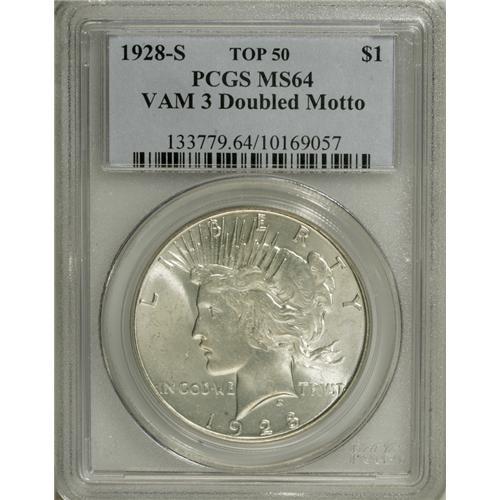<B>1928-S S$1 MS64 PCGS.</B></I> VAM-3. A Top 50 Variety. Doubling shows on the TR of TRUST and on the monogram. Essentially untoned surfaces reveal just a trace of color on Liberty's neck, and exhibit well impressed design elements. A few minute marks define the grade.<BR><BR><b>Shipping:</b> Coins & Currency (<a target="_blank" href="http://www.heritageauctions.com/common/shipping.php">view shipping information</a>)