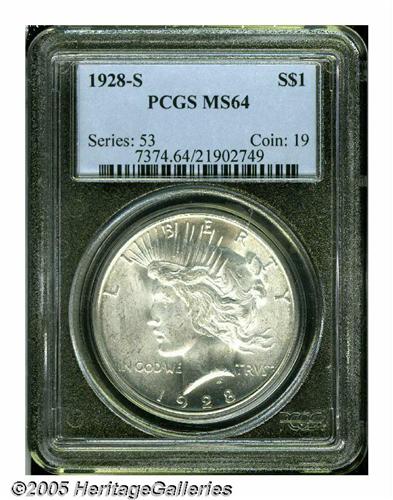 <B>1928-S<S$1> MS64 PCGS.</B></I> VAM-4. A lustrous, brilliant, and nicely struck near-Gem of this popular and conditionally scarce S-mint Peace Dollar. The central letters in the motto are die doubled.