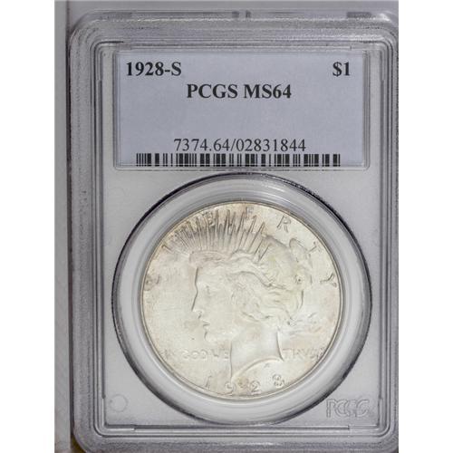 <B>1928-S<img border='0' src='http://www.heritagecoins.com/images/star.gif' width=10 height=10>$1> MS64 PCGS.</B></I> VAM-4. Olive and powder-blue tints enrich this satiny near-Gem. The cheek and the obverse field are uncommonly smooth. A reasonable strike for this conditionally tough issue.